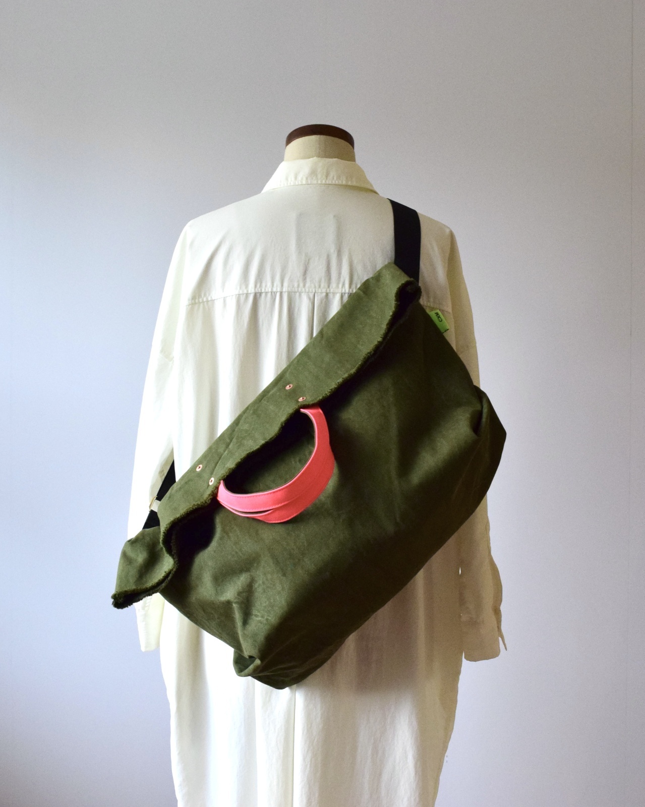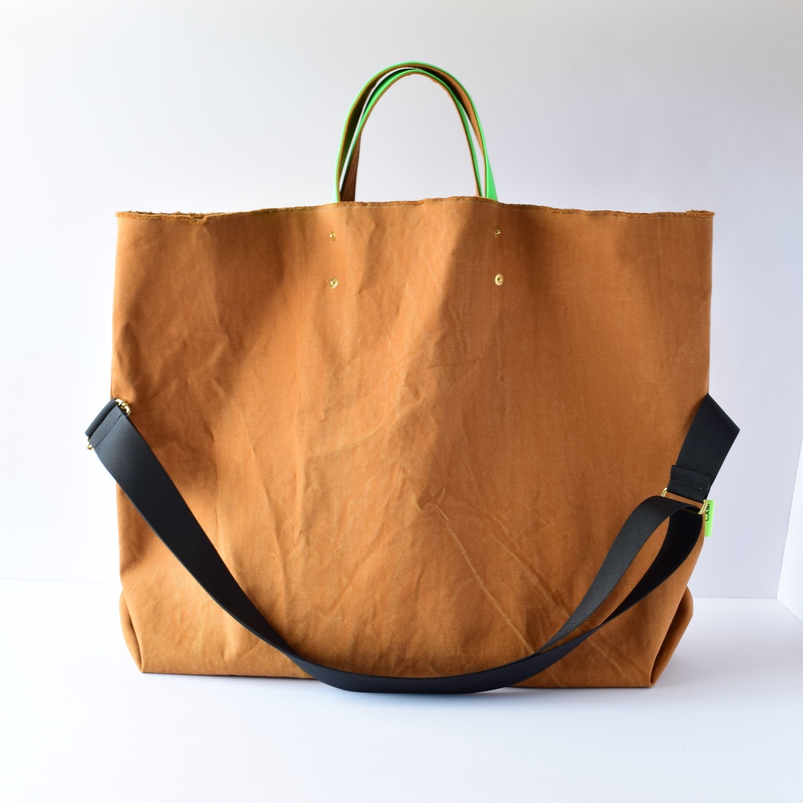 The back features a large pocket. Using fluorescent colors on the handles or pockets gives it a modern touch—find your favorite combination!