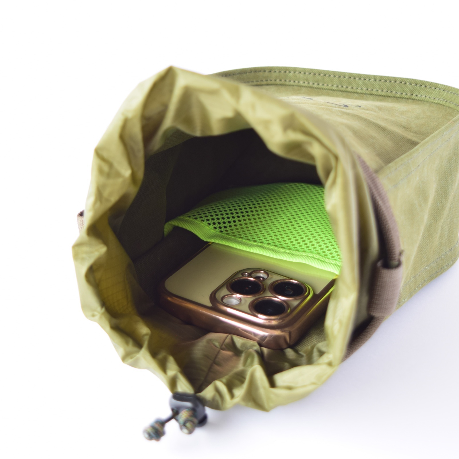 Just like the chalk bag, it opens and closes with a drawstring-like structure. Made with water-repellent nylon, it can handle light rain without any problems.
